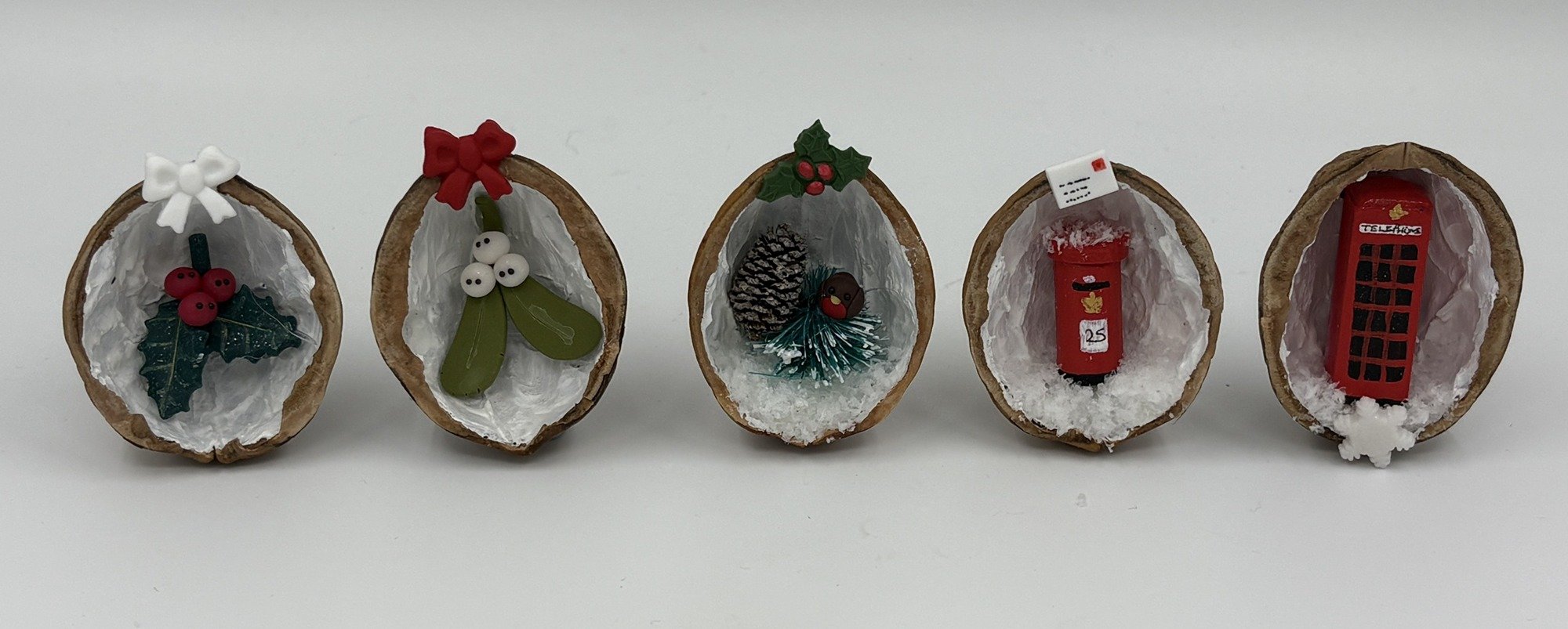 Each item is individually made using a walnut shell as a starting point, with a variety of other materials.